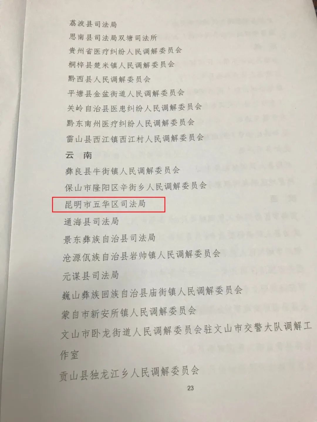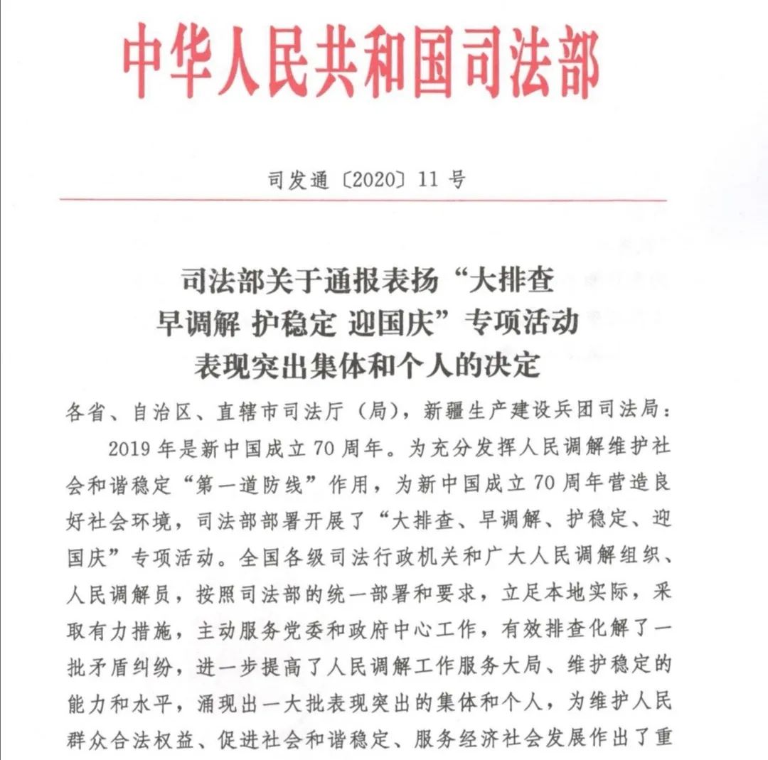 日前,司法部印发《关于通报表扬“大排查 早调解 护稳定 迎国庆”专项活动表现突出集体的决定》,对在2019年度人民调解“护维稳,迎国庆”工作中贡献突出的先进集体进行表彰,五华区司法局荣获“‘大排查 早调解 护稳定 迎国庆’专项活动表现突出集体”荣誉称号,成为昆明市唯一一家受表彰的先进集体。