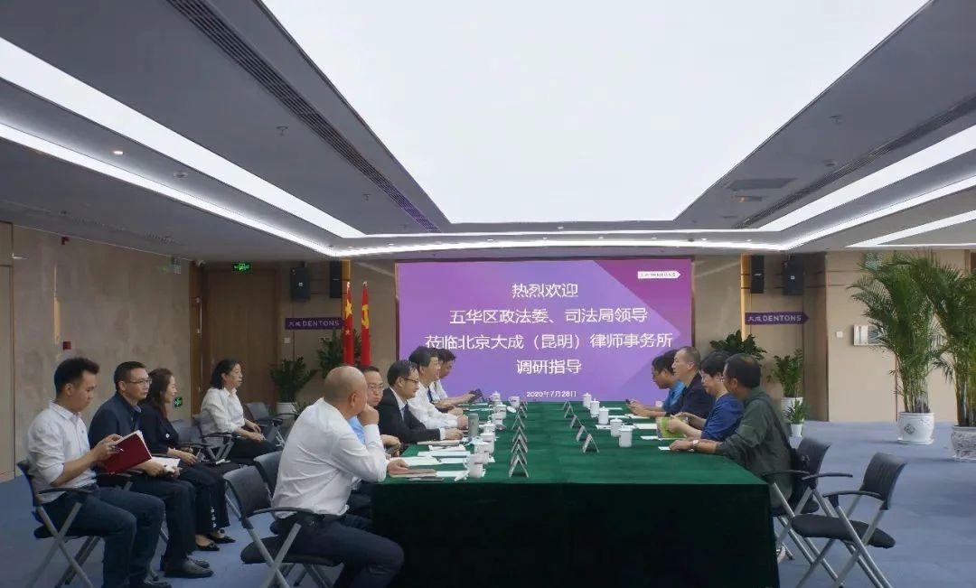 2020年7月28日,五华区委常委、政法委书记李江带队,区委政法委刘亚锟副书记、区司法局王瑜局长、马俊副局长、律师工作管理科相关人员一行先后到北京大成(昆明)律师事务所、建纬(昆明)律师事务所走访调研。