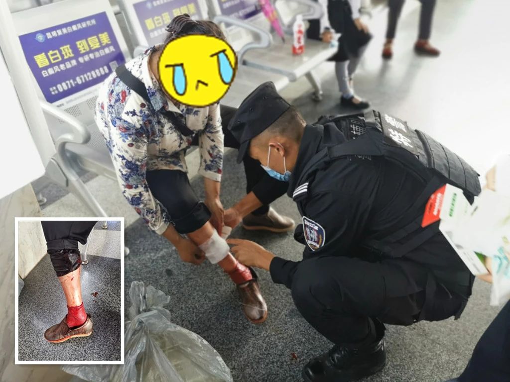 原来,这位旅客是做园艺工作的,到昆明买了些园艺工具就带着东西准备乘车回老家,没成想袋子里的园艺工具戳破了袋子,因为要急着赶车回家,在拖动袋子时她的小腿不慎被刺伤了,一路过来也没顾得上处理伤口,这才出现了最初的那一幕。
