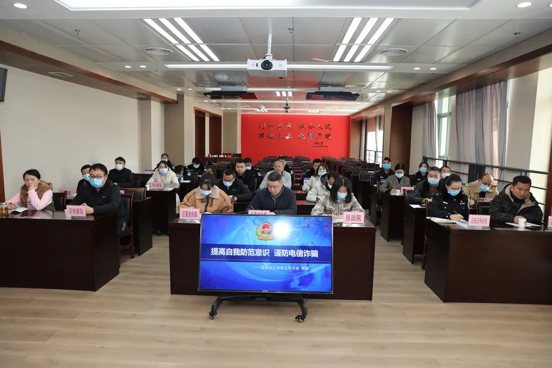 近日,五华区委政法委举办全区反诈宣传教育培训,区委政法委副书记高原作培训动员讲话,会议由公安五华分局副局长吴睿同志主持,平安五华领导小组有关成员单位和10家街道办事处具体负责人到主会场参加培训。会议以视频形式开至各派出所,全区居民委员会、村(组)具体负责人到分会场参加培训,参加培训人员共计500余人。