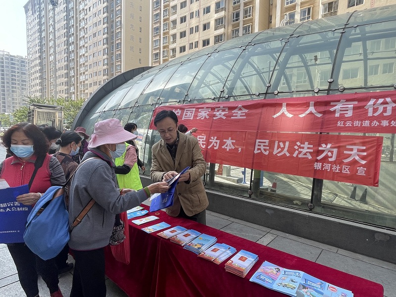 一是结合辖区实际组织开展国家安全主题普法宣传活动。4月13日,红云司法所、综治办、银河社区工作人员在和谐世纪官场设置宣传点,悬挂国家安全法治宣传标语,向群众发放普法宣传材料,宣传解读国家安全法律法规内容,引导群众牢固树立国家安全观。通过联合开展“4•15 全民国家安全教育日”宣传活动,进一步提升主题宣传教育知晓率和参与率。