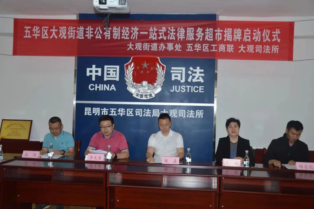 为进一步加强法治化营商环境建设,更好地促进五华区民营企业发展,6月17日,由五华区大观街道、五华区工商联、五华区司法局联合创立的五华区大观街道非公有制经济一站式法律服务超市举行揭牌启动仪式。五华区政协副主席、五华区工商联主席魏嘉出席并致辞,五华区司法局局长王瑜,五华区大观街道办事处主任李文豪出席仪式,公安五华分局大观、新村派出所相关领导和五华区司法局大观司法所全体干警,及多家律师事务所主要负责人参加揭牌仪式。
