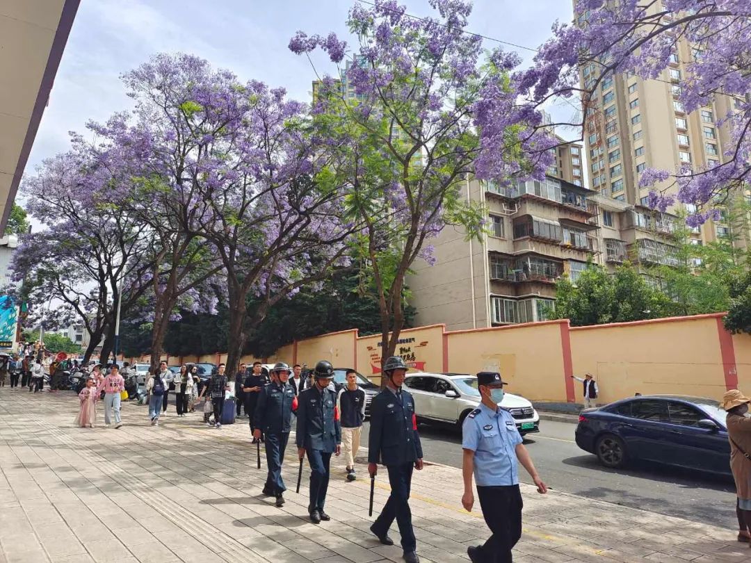 教场中路一带的蓝花楹进入盛花期,伴随着蓝花楹艺术节的开幕,使得这一区域的人流量大幅上升,每日游客大约7万人左右。莲华派出所及时增派警力加强巡逻防控,全力确保蓝花楹树上的风景靓丽,树下游客平安。